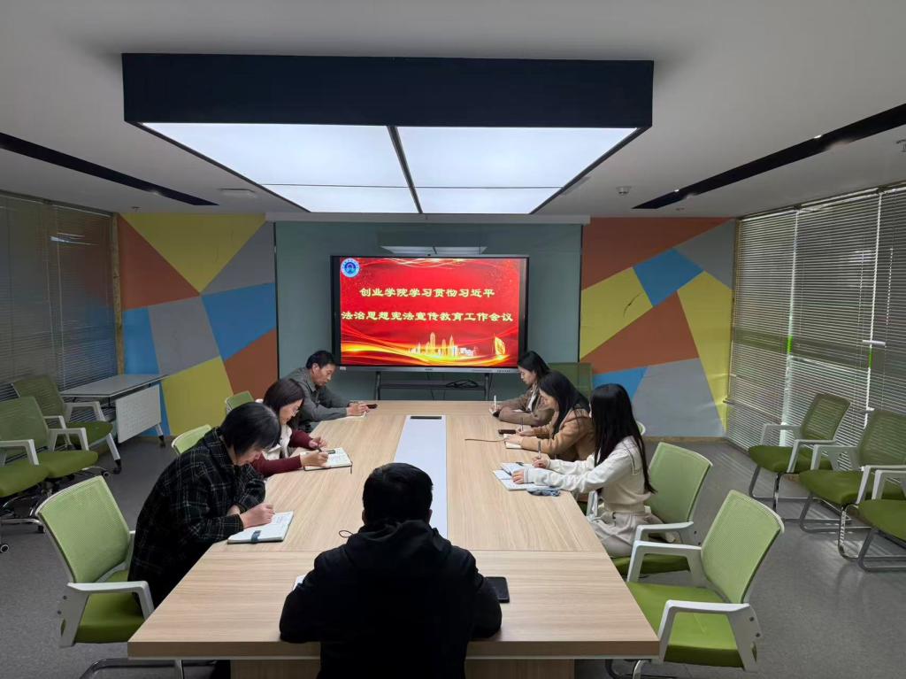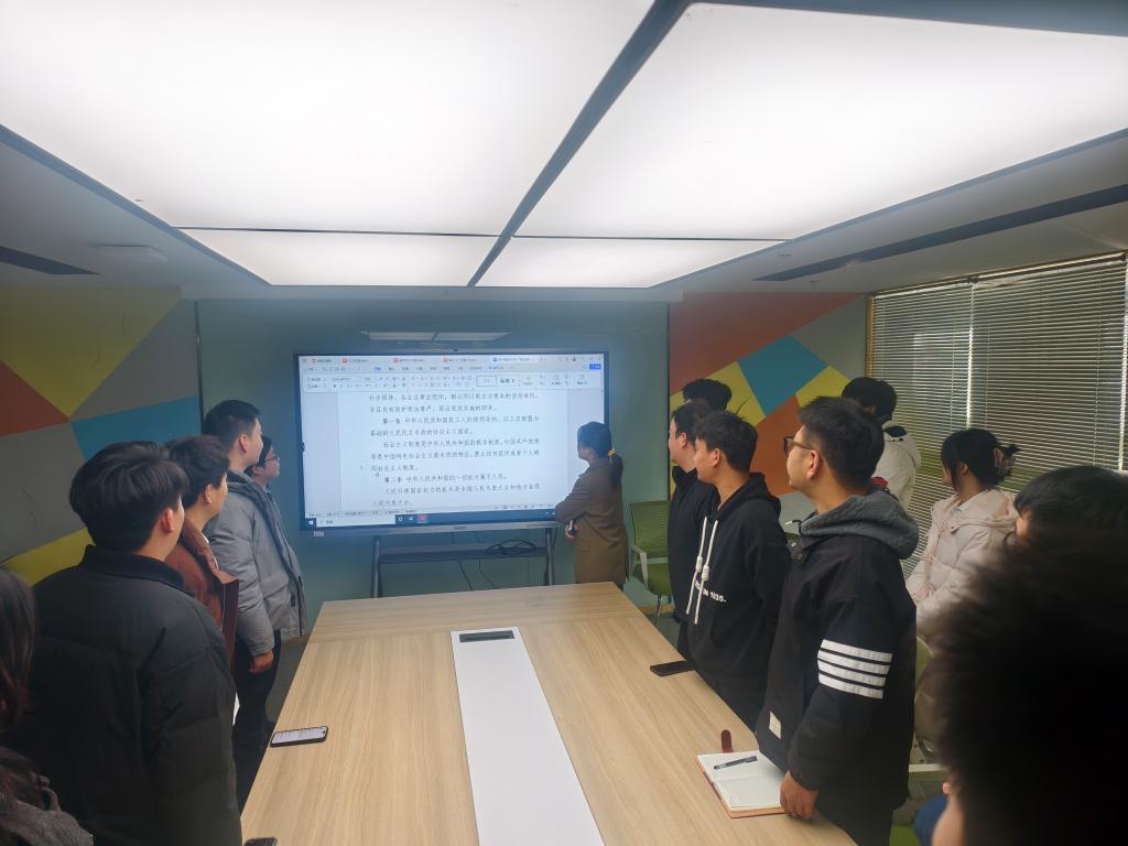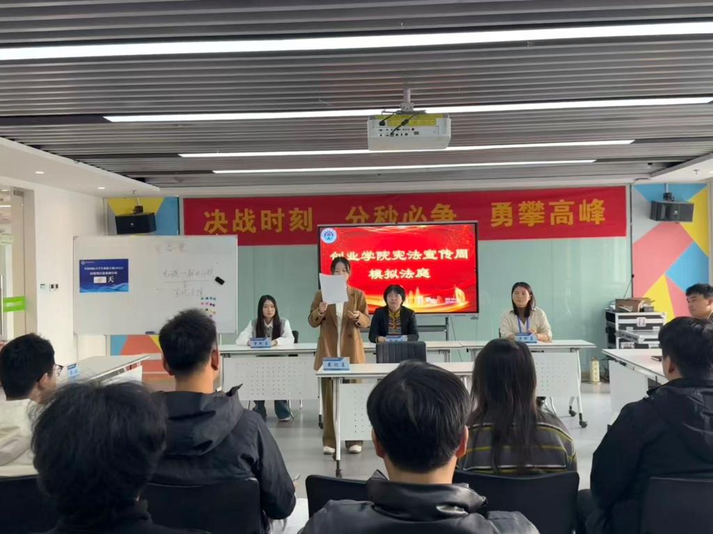 活动开始,创业学院于12月1日组织开展了针对教职工的法制宣传教育活动,创业学院副院长温宗和带领创业学院教职工进行了“创业学院学习贯彻习近法制思想宪法宣传教育”会议,强调了法治教育的重要性。随后,在12月4日,秦瑞军老师针对全院入驻项目学生进行了普法会议,结合创业实际,剖析相关法律风险与规范。同日,卢雨佩老师组织了宪法晨读活动,带领各入驻项目负责人集体诵读宪法条款,感受宪法的庄严与权威。理论教育环节结束后,活动转入实践与深化阶段。学院在12月5日,策划了模拟小法庭活动,教职工和入驻项目的法人共同扮演法庭角色,完成了一起小微企业民事诉讼的模拟法庭。随后,各入驻项目法人代表围绕“小微企业经营中常见经济纠纷的防范与化解”展开专题讨论,大家结合自身实践交流经验,共同探索依法合规的经营路径。